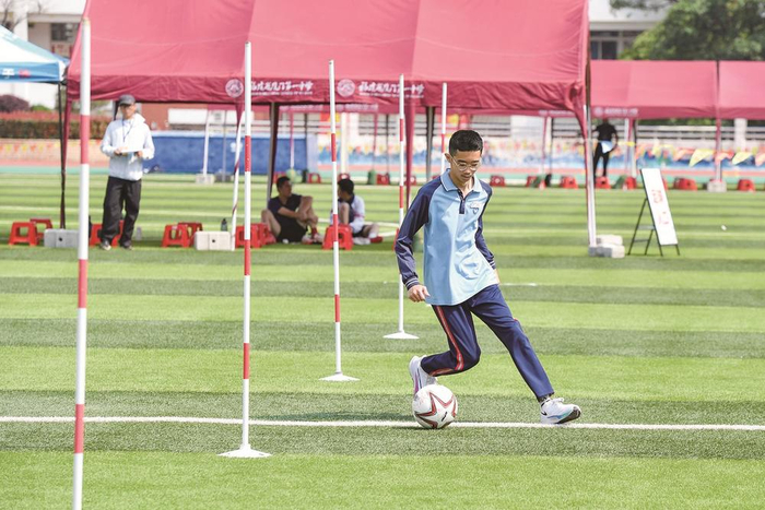 昨天上午,厦门一中思明校区高中部考点迎来了厦门九中的585名考生,考生错峰入场,分组分区,三大球类测试区有序开考,互不干扰,各球类测试区域附近也都设置了考生练习区。该考点选考排球的考生数超过一半以上,对比之下,足球、篮球的考场就显得有点冷清。