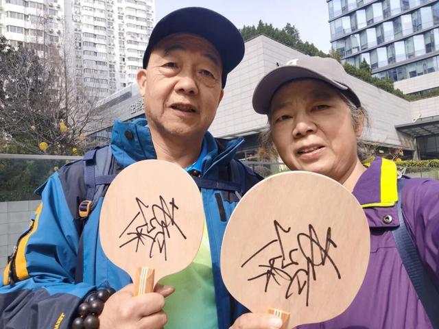 退休后,贾毅萍与老伴到上海与女儿一起生活,平时夫妻俩喜欢打乒乓球。贾毅萍说:“田林社区市民健身中心有免费时段,我们也会到徐家汇社区活动中心和徐家汇体育公园打球。上海城市有温度,上海人特别好,对我们外地人很热情很友好。”她特别拿出自己跟老伴的照片,两人拿着签名球拍,“拍子上的签名是世界冠军曹臻,正好3月底上海有个活动现场,我们拿到了签名球拍。”